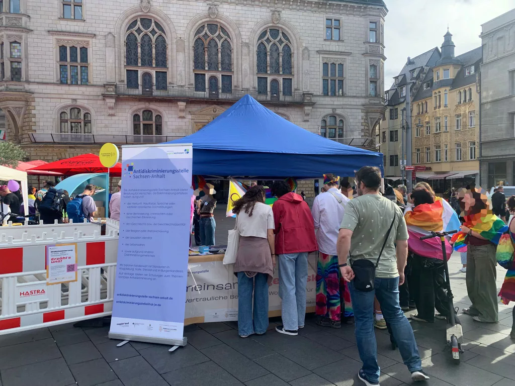 Unter dem Motto „Auf die Barrikaden, Meine*r!“ fand am 13.09.2025 der hallesche CSD statt. Auch bei diesem CSD war die Antidiskriminierungsstelle Land Sachsen-Anhalt mit einem Stand vor Ort auf dem Marktplatz.