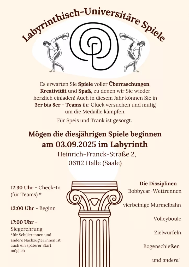 Wie bereits angekündigt finden am 03.09.2025 nun schon zum dritten Mal die labyrinthisch universitären Spiele für Erwachsene und Kinder aus der Stadt Halle und dem Saalekreis statt. Ausrichter ist dieses Mal wieder das LABYRINTH. In selbst kreierten und witzigen Sportarten können Sie sich ausprobieren und  mit anderen