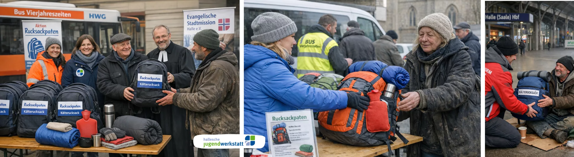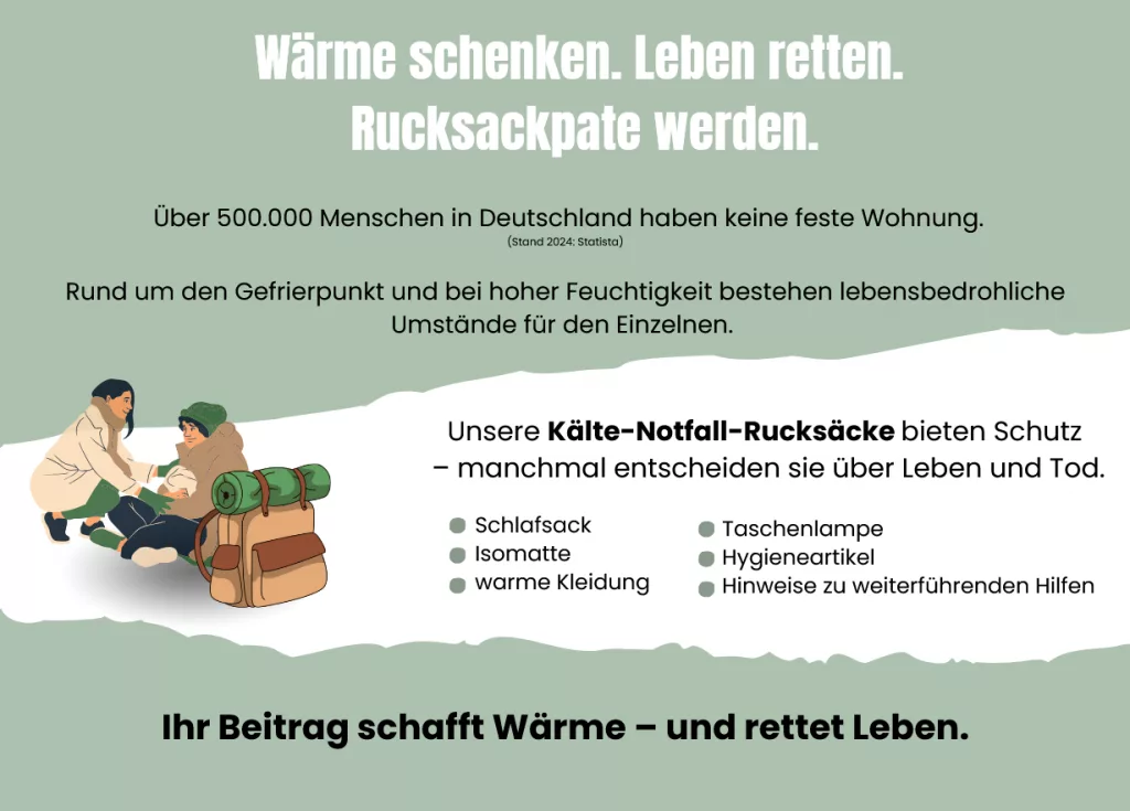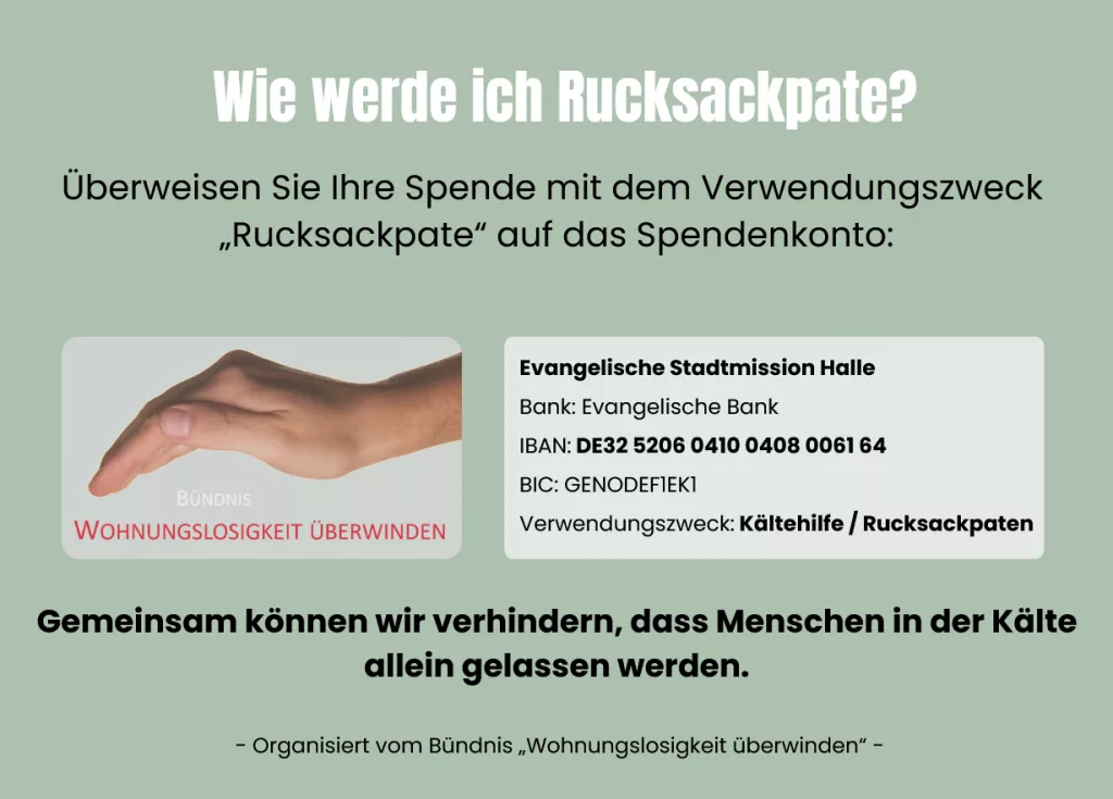 Im Rahmen des Bündnisses „Wohnungslosigkeit überwinden“ haben wir als SCHIRM-Projekt und den anderen Partner*innen (z.B. Bus Vierjahreszeiten, HWG, Evangelische Stadtmission etc.) die Aktion „Rucksackpaten“ ins Leben gerufen. Hierzu kann Jeder eine beliebige Summe an die im beiliegenden Flyer angegebene Bankverbindung spenden. Mit den Spenden werden dann Kälterucksäcke mit Winterequipment (Schlafsack, Wärmeflasche, Thermoskanne etc.) für wohnungslose Menschen finanziert und an Betroffene ausgegeben. Die ersten Rucksäcke sind bereits finanziert, gepackt und können ausgegeben werden.